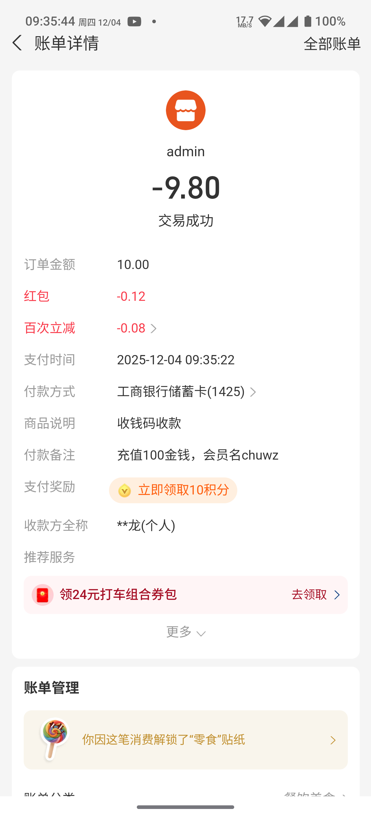 chuwz 发表于 2025-12-4 09:37 你好,已付10元(100个金钱),备注了会员名chuwz,请充值一下,这是付款截图 ...